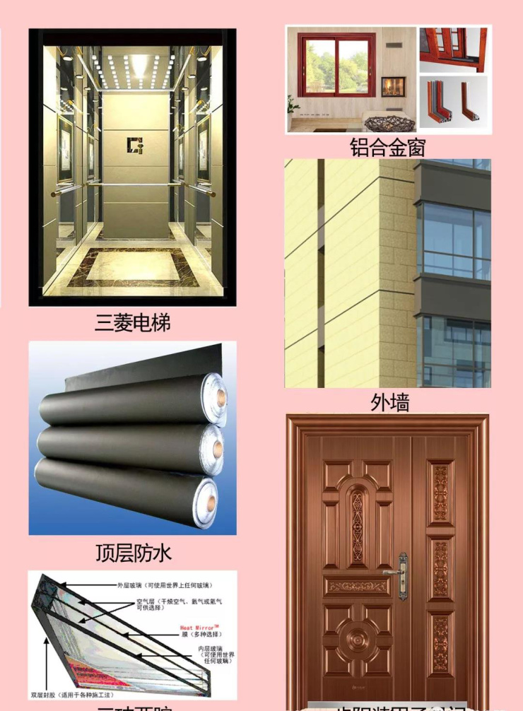 项目采用三玻两腔玻璃、隔热断桥铝合金窗,为您营造宁静舒适的生活环境;步阳装甲子母门、上海三菱电梯保障业主安全,彰显高端社区之品;干挂大理石+高档瓷砖外墙匠心筑造,致敬品质生活;优质墙体保温、楼顶屋面精工保温、防水工艺细致入微,精工匠造理想人居。