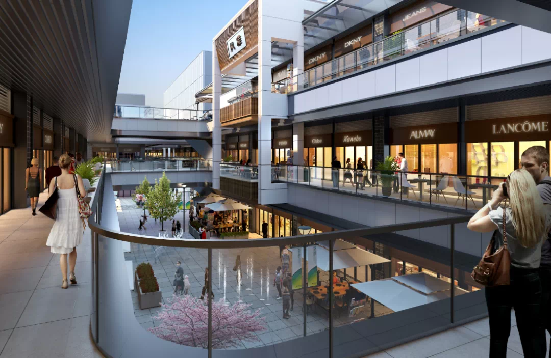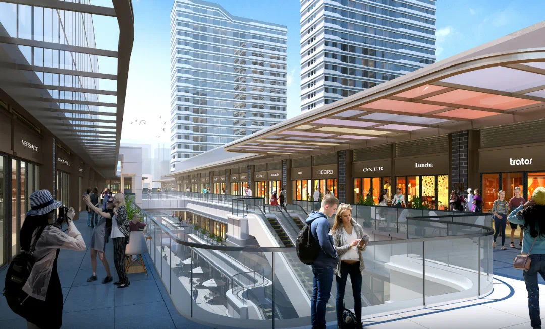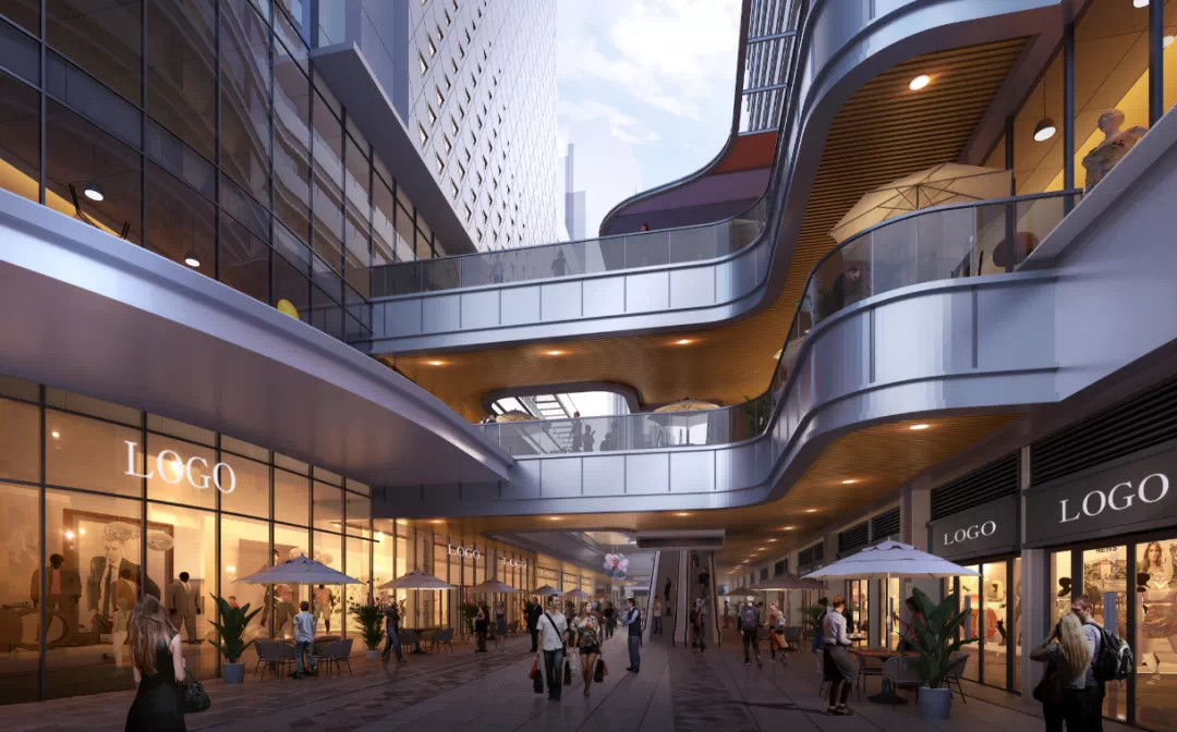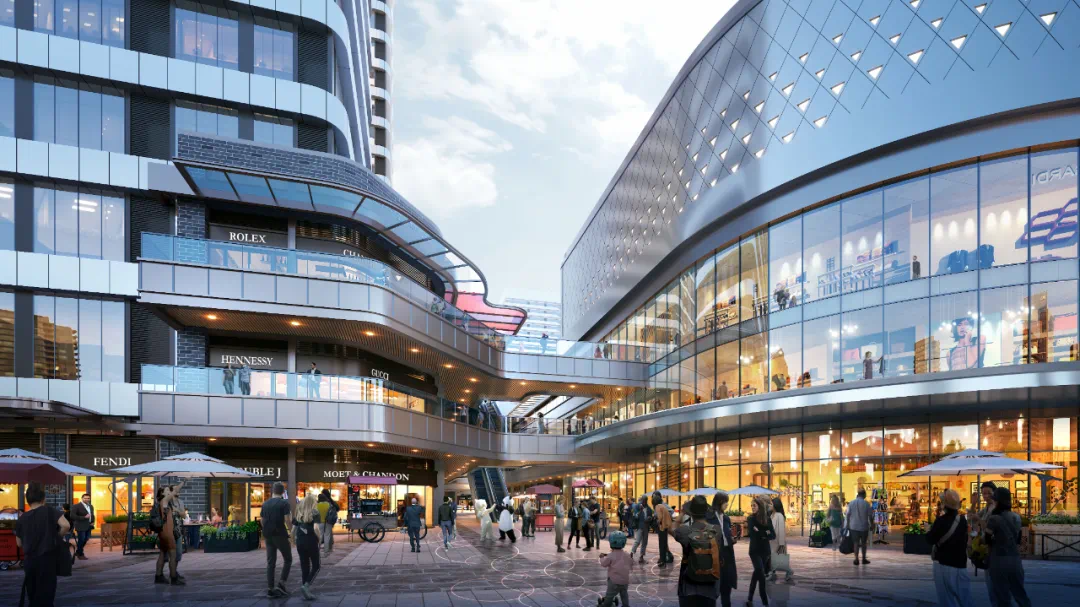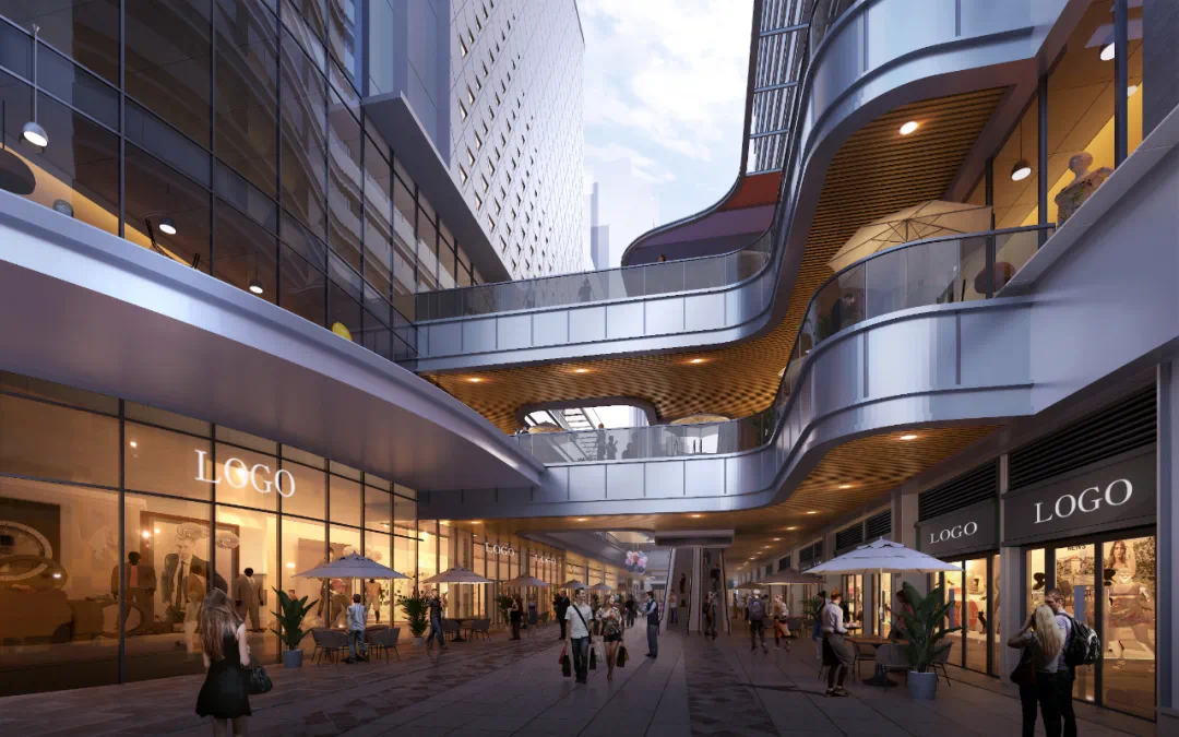 层高五米,创新“三首层”设计,通过扶梯、连廊、环形通道等建筑交通元素的布局应用,实现铺铺沿街,层层首铺。