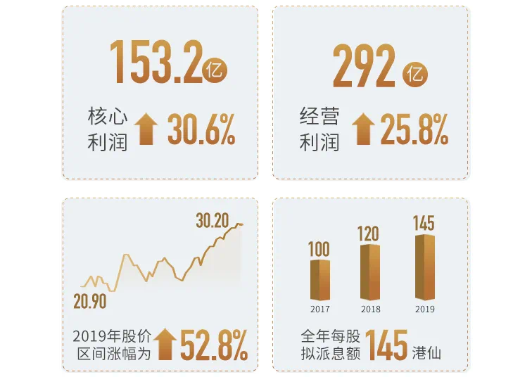核心利润153.2亿元,同比大幅上升30.6%;经营利润292亿元,同比上升25.8%。秉持共赢共享理念,世茂2019年股价区间涨幅为52.8%(据万得区间涨幅数据,含派息等因素)。全年每股拟派息额145港仙,同比上升20.8%,涨幅高出2018年0.8个百分点。派息稳定增长,持续高效回报股东。这已是公司连续第14年分红。