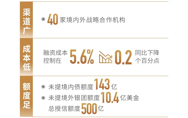 世茂2019全年融资成本控制在5.6%左右,较2018年全年5.8%下降0.2个百分点,维持在行业较低水平。报告期内境内外战略合作机构达40家,未提境内债额度人民币143亿元,未提境外银团额度10.4亿美金,总授信额度达人民币500亿元。
