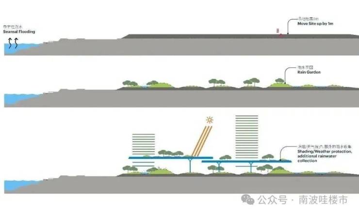 将地面空间开放给行人、绿植,不仅能美化环境,还能很好的应对气候环境所带来的洪涝挑战。(如上图)