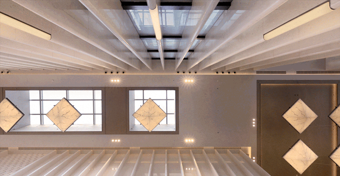来自中興傲舍精心烧制了不同两种形态的陶瓷砖,再巧妙嵌入小型射灯