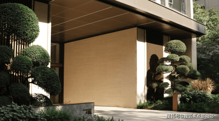 单元入户门厅则延续了对称美学,米色系石材与金属格栅的搭配,在光影变幻中刻画出雅致纹路。造型松与球类灌木绿意盎然,玻璃门上「欢迎回家」的红色装饰点缀出人间烟火气的温暖。