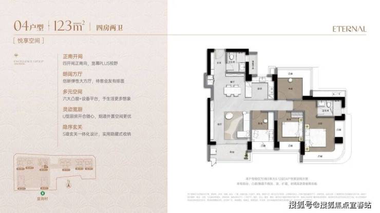 采用双龙抱珠格局,灵活适配成长型家庭。LDKB一体式布局,配备270°环幕主卧套房、U型厨房及七大飘窗,空间动静分离,实用且可变。