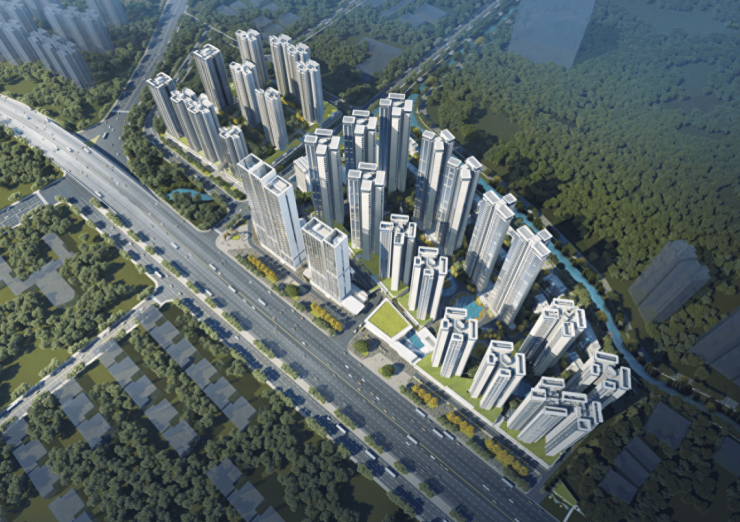 小区的空间布局遵循“一纵一环九节点”,整体为现代化简约风格,结合周边珍贵自然资源,设计理念融合山色与流水概念,创造以“流动 的森林”为主题的园林。