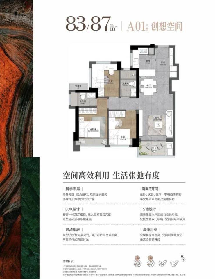 提供83-113平方米的3-4房户型,空间利用率高,如83-87㎡的3房2厅2卫户型采用经典竖厅格局,LDKB一体化设计,三开间朝南,得房率约76-81%(不含赠送),部分户型赠送后得房率可达88-93%,性价比高。