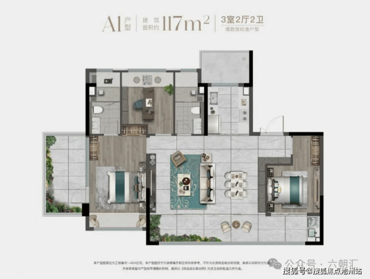 约117㎡灵动户型,近100%空间使用率,演绎市场140㎡大平层的奢阔居感......