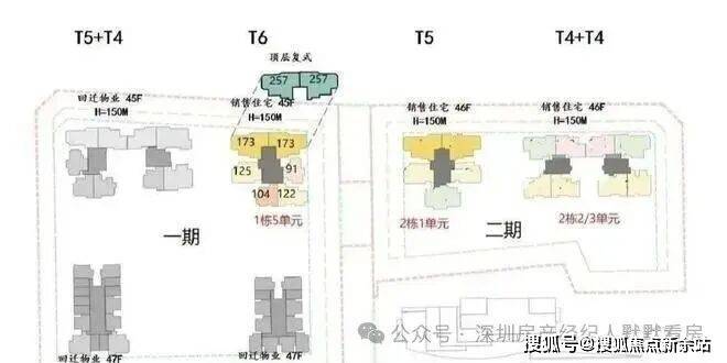 首推一期1栋5单元(45层),91-173㎡3-4房,共232套,以122-175平米4房为主,占比83%,还有两套257平顶复产品。173/257平大户型双电梯独立电梯厅入户,南区91-125平户型3梯4户。