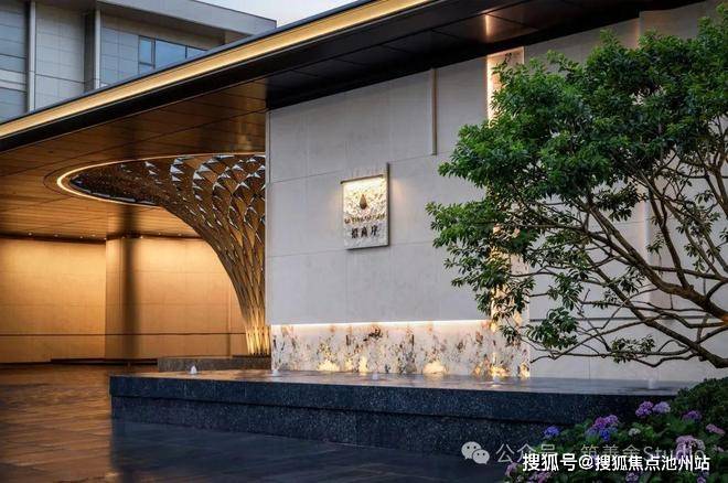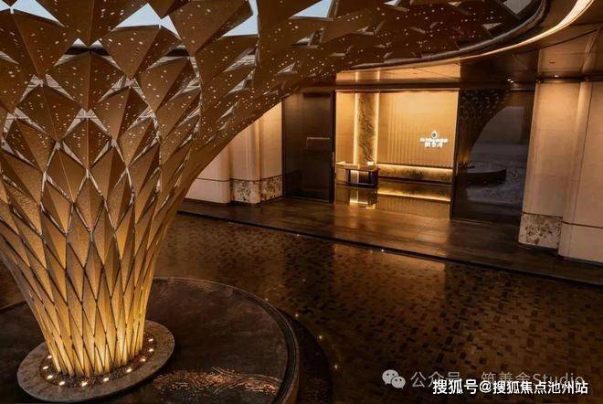 主入口设计借鉴酒店环岛落客风格,顶部巧妙开洞,艺术雕塑装置与之浑然一体,巧妙融合了天圆地方的传统文化理念。归家之路不仅彰显尊贵与庄重,更赋予了一种别具一格的仪式体验。