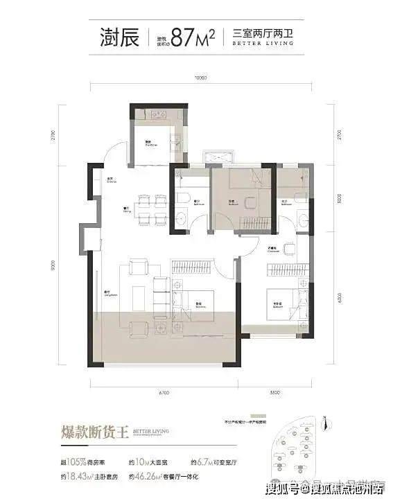 面积从87-99-108-122-139,其中87平也是三房两厅两卫。户型图暂时还没有出来,预计6月19号才能对外展示(开发商想保留一点神秘感,据说得房率在103-108%),住宅容积率为3.0。