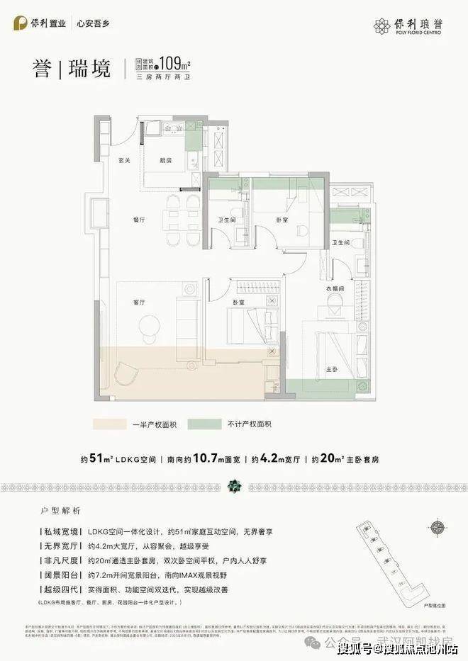 109㎡户型:三房两厅两卫,该户型为三房两卫,三开间朝南,入户玄关收纳空间,南向面宽约10.7米,约7.2米的南向宽景阳台,51㎡的动区空间,约20㎡的主卧套房,还是双卧朝南设计。此外,主卧、次卧、厨房有不少全赠送空间。