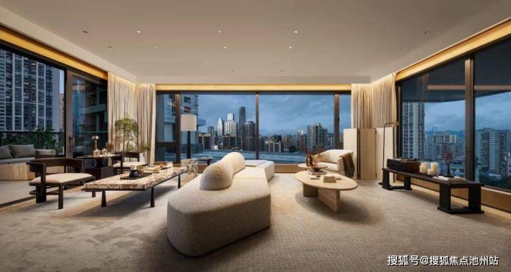 比如建面约185平米的户型,客厅是一个巨大的方厅,并且3面都是巨幅落地窗,室内外完全无界,配合窗外的度假园林和观音桥的繁华盛景,视野可以用壮丽来形容。这样的尺度感和设计,在重庆豪宅圈也不常见。