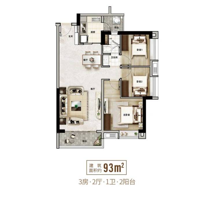 ——户型鉴赏——【建面约93㎡ 舒居三房两厅一卫双阳台】