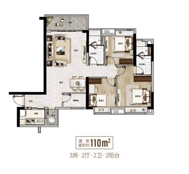 【建面约109㎡ 瞰景大三房两厅两卫双阳台】