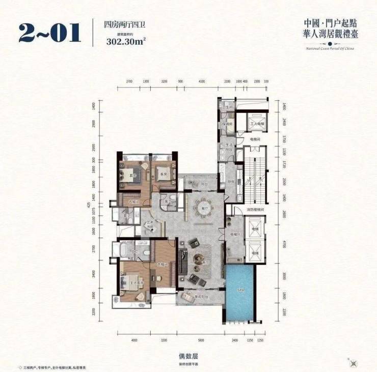 该项目总占地面积约8,906平方米,规划总建筑面积为53,483平方米,由2栋塔楼组成,都为39层,一梯两户,总户数148户的稀缺珍品。项目户型是正南北朝向纯板式结构,南北通透。内部标准层层高3.3米,偶数层配备的私家游泳池层高米。