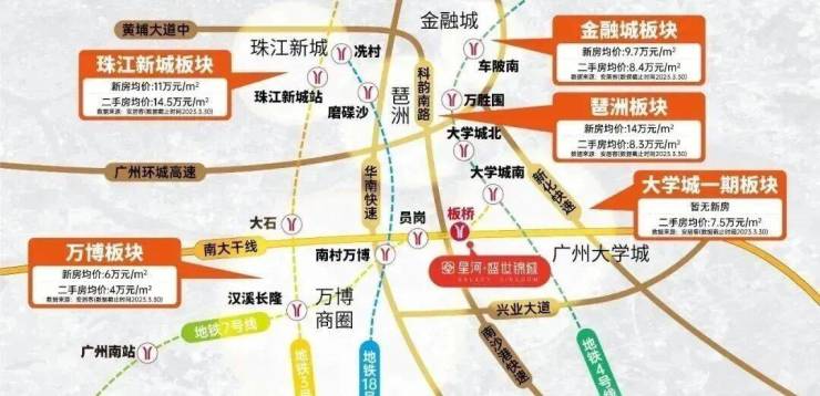 交通地铁:星河盛世锦城位于万博 CBD 北侧,直线距离 7 号线板桥站约 700 米(三期组团稍远),实测步行 10 分钟内可达。地铁 2 站到万博、5 站到琶洲,换乘 18 号线可快速通达珠江新城,适合在天河、海珠上班的通勤族。自驾方面,出门即上南大干线,无缝连接广州南站、金融城等核心区,实测 30 分钟可到珠江新城,交通便利性是最大卖点之一。