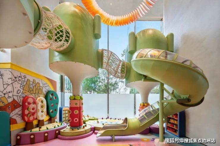 绿城·知海棠后来怎么做?以童玩空间为例,表面上只是做个超大的童玩区,将整整一幢楼的架空层全部开辟出来,面积近500m²。站在庭院中央,抬眼即是高达近8米的全景舱树屋,有着绿野仙踪里翡翠城的样子。探头进去,几人高的丛林滑梯纵横交错,一只巨大的“火烈鸟”盘旋而下。