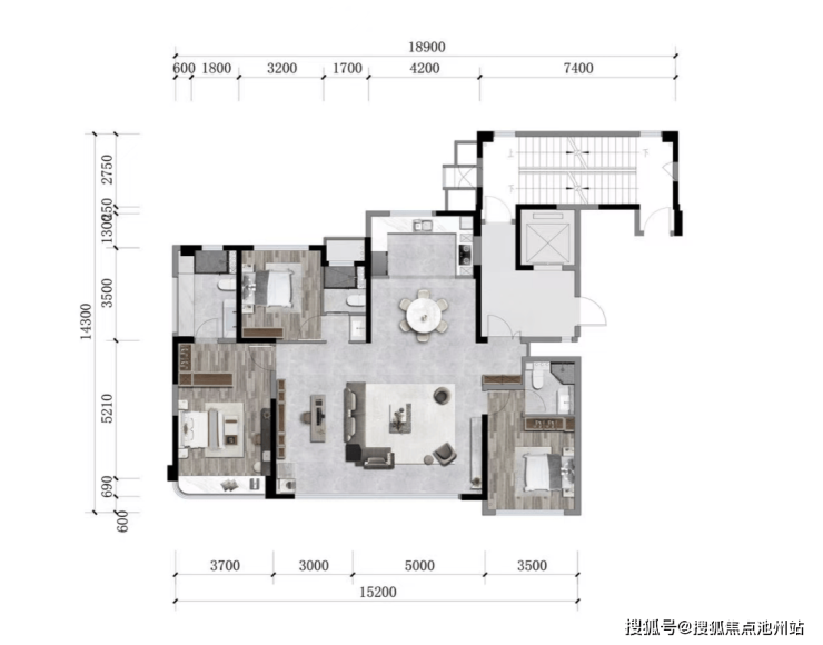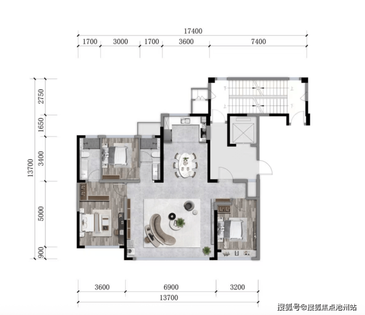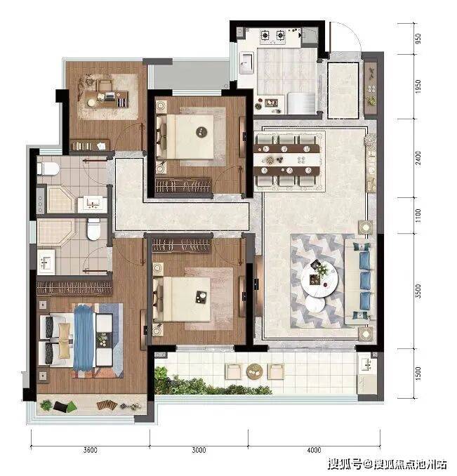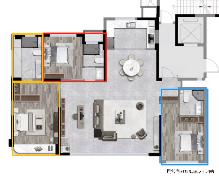 它看起来动静分区,还有三个起居室+书房,满足一家四口,而真正到了现实中,你会发现