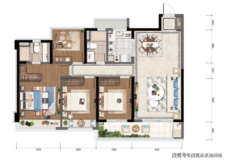 事实上,天曜序139方户型还有很多百变的设计,最简单的,比如还可以做到3套房模式——
