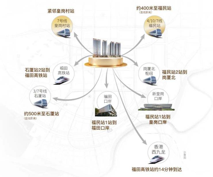邻近皇岗村站和福民站,周边四线交汇,2站速达福田高铁站,3站直通岗厦北枢纽,待2026年新皇岗口岸落成后,轻松构建深港黄金中轴生活圈。