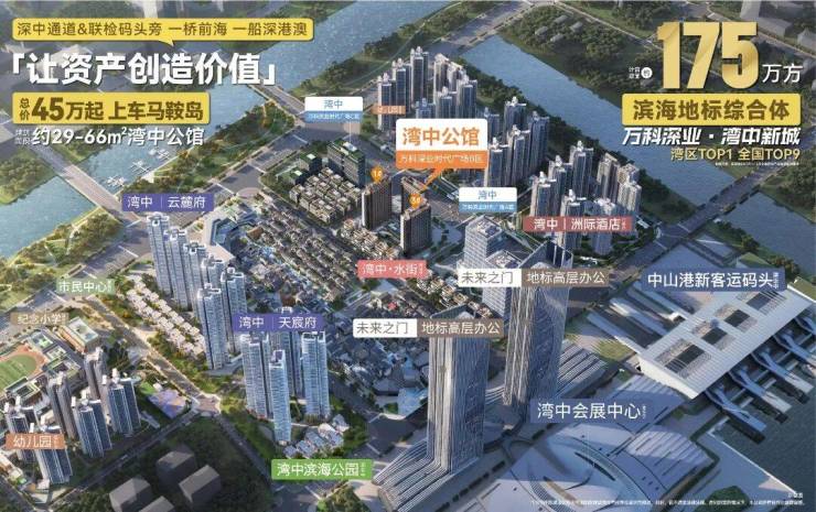 湾中新城是目前岛上唯一对望前海的滨海综合体,万科和深业强强联手,布局八大业态,从联检码头、会展中心、商业街区、写字楼、公寓以及滨海住宅等多种复合型业态,其中约249米的地标双塔——未来之门,更被喻为“中山东大门”,为这座航母级的封面地标,带来更多可能。