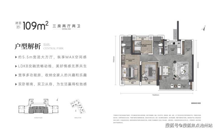 约5.5m阔尺方厅/LDKB一体化/双卧朝南/双卫从容