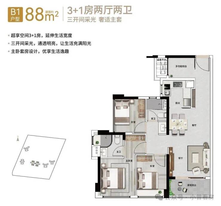 【88㎡3+1房2厅2卫】阔绰横厅格局,南北通透