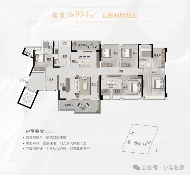 【194㎡五房2厅4卫(三套房)】南北对流双景观阳台,约32㎡奢华主套,配衣帽间
