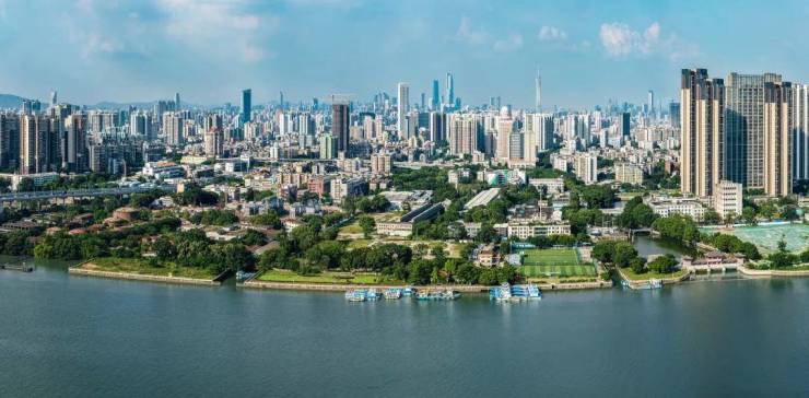 开阔的珠江在旁缓缓流淌,天高云阔的时候,对岸海珠创新湾熠熠生辉的摩天大楼清晰可见,还能望见广州塔建筑集群霸气的城市天际线。