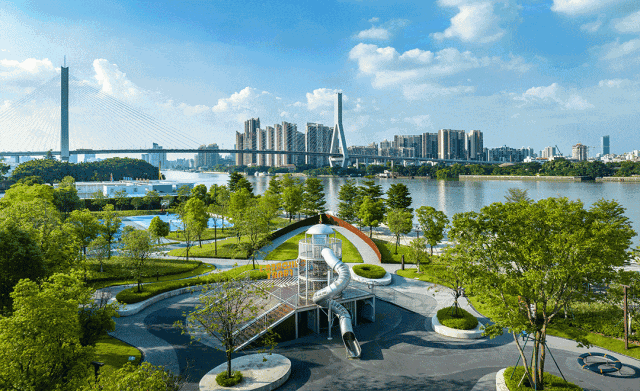 更难得的是,在这一眼望不到尽头的江岸线旁,便是规模高达18万平的滨江公园,串联以纽约中央公园为蓝本打造的广钢中央公园,整个公园景观带足足有60万平!