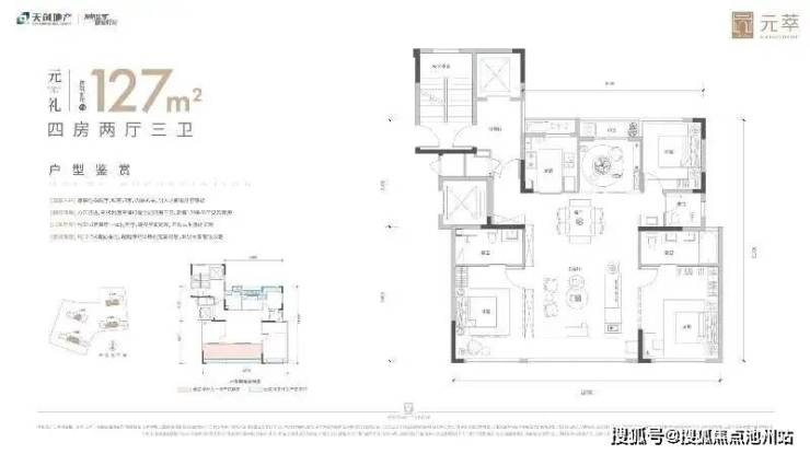 127平做成了四房三卫双套房的设计,功能性超级强,三代同堂或者二胎家庭也非常适合;南向面宽12.7米,采光面也是比较充足的,缺点是有个套房内的洗手间为暗房,除此之外,其他方面都很不错。