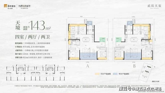 项目为准四代住宅全部四房,洋房270度全景舱,得房率均在90%以上,最高近100%,简直是二七滨江今年的王炸!