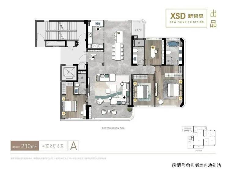 建面约218㎡户型,同样是方正的四房设计。该户型采用动静分区式设计,既保障了私密性,也最大程度上将景观体验感拉满。