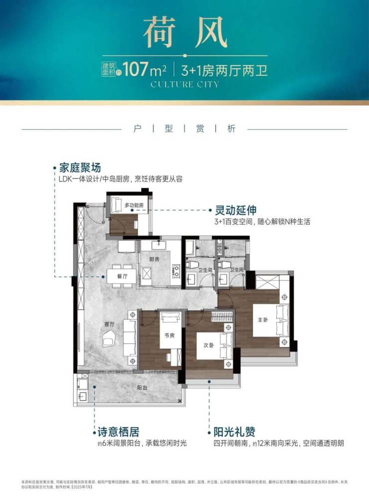 以建面约107㎡3+1房为例,该户型拥有约6米奢阔阳台,配合LDK一体化设计,整体呈现约12米南向采光面。