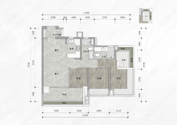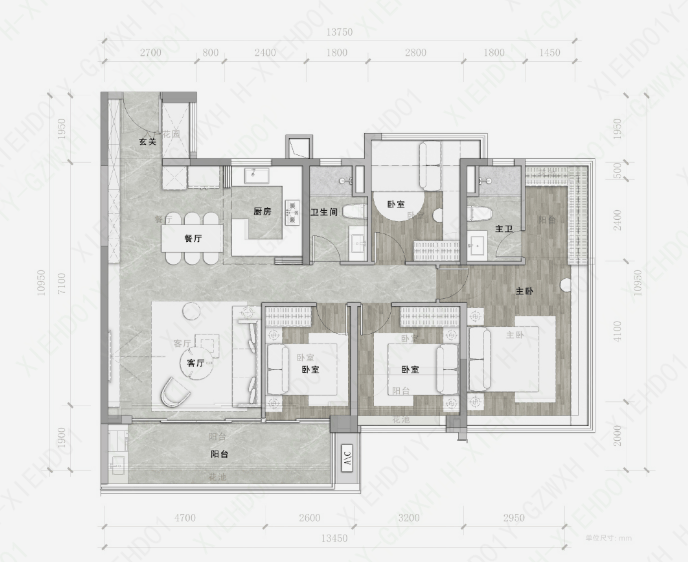 约27m²超级主卧,预留女王级衣帽间位置、270°转角飘窗。