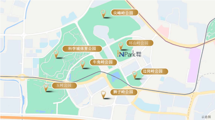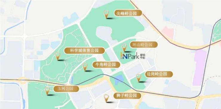 INPARK星贸中心,自带原生山体公园,享2条私家登山道,连接1条环山步道,依次串联科学城体育公园、玉树公园、狮子岭、牛角岭、尖峰岭、边岗岭等6个公园,惬享约13km环山美景。