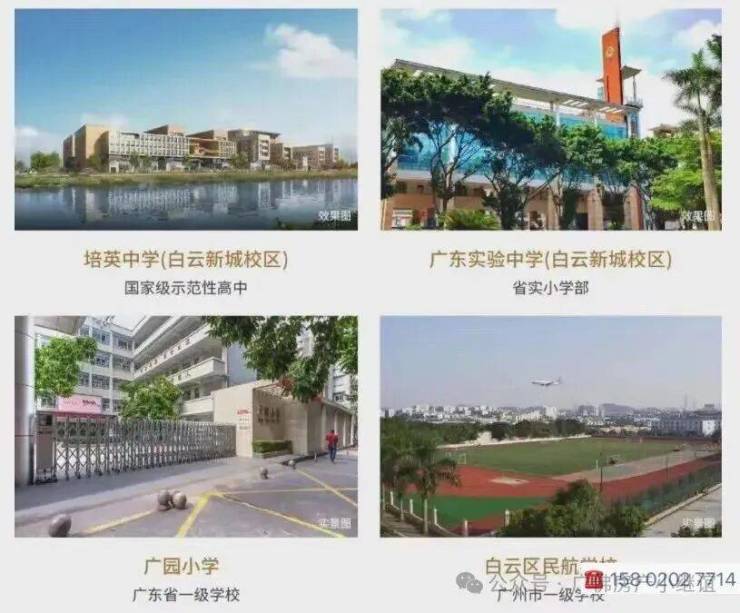 国家级示范性中学--培英中学(白云新城校区),省实小学部--广东实验中学(白云新城校区),广东省一级学校--广园小学,广州市一级学校--白云区名航学校。