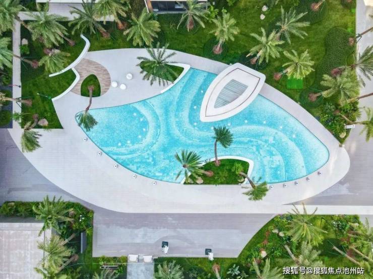 银海枣树疏密有致地排序,格调独特的水景呈现出灵动的 “水波纹理”,波光潋滟。以 “游艇” 为主题打造的下沉卡座廊架别具匠心,三者相互映衬,将度假氛围渲染到极致 。