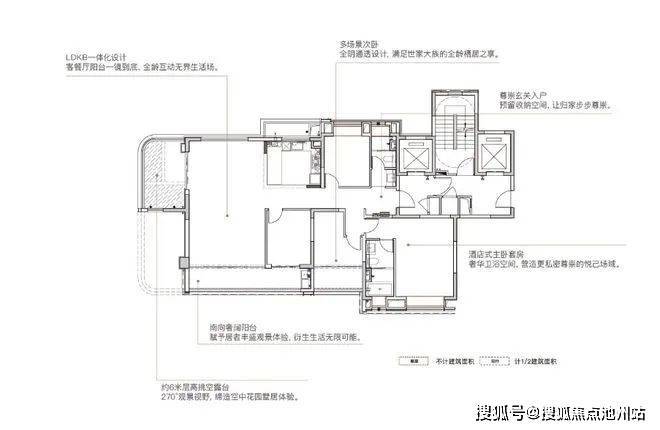 客厅和餐厅、厨房南北通透,加上南向阳台,采光通透,实现真正的大开间、大进深、大平层级的空间感受,尺度太奢阔了。