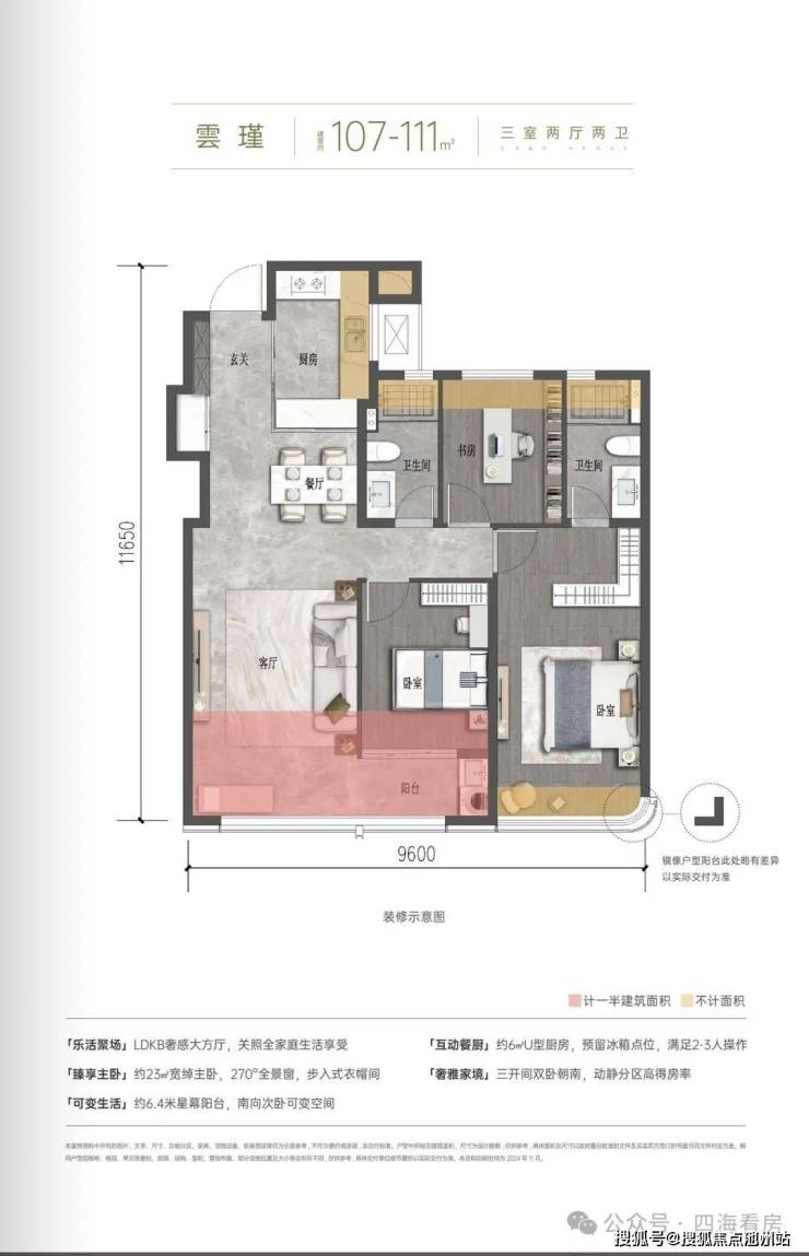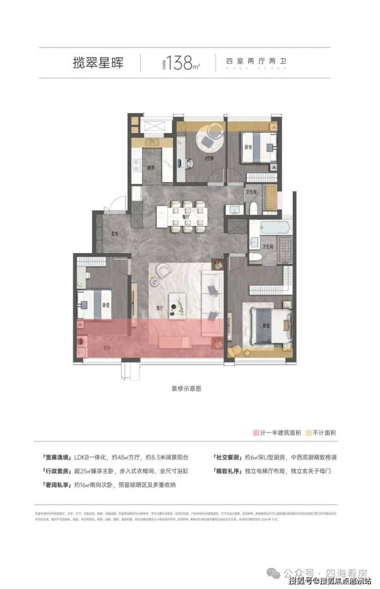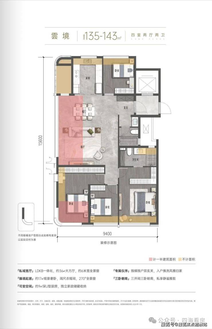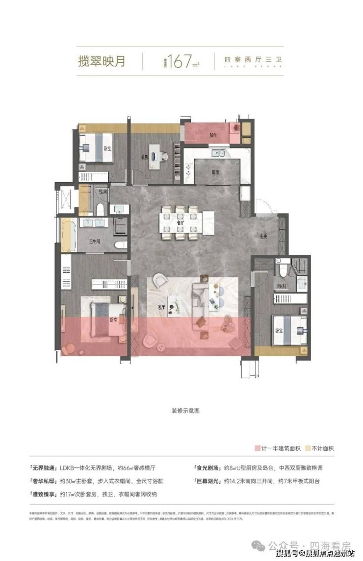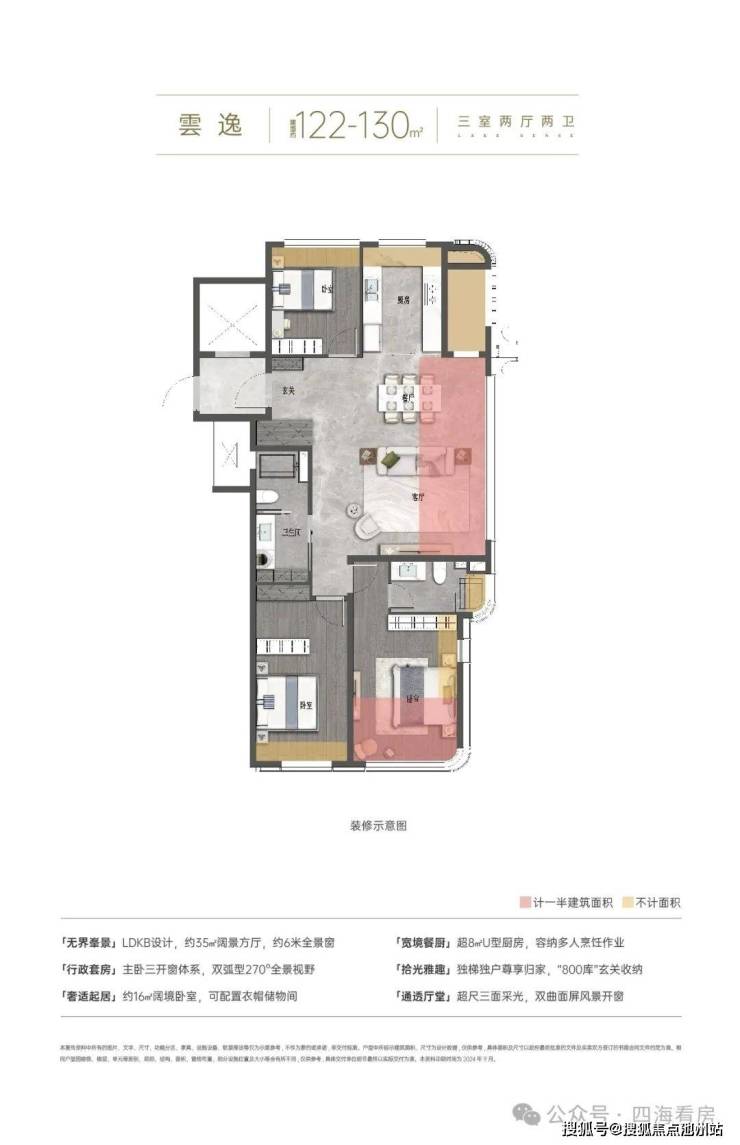 🔹准四代户型设计,实现约93%-103%超高得房率,营造“270度全景舱”、“双主卧奢阔套房”、“LDKB+X无界空间”、“三开间阔绰尺度”等,呈献湖滨美学作品。