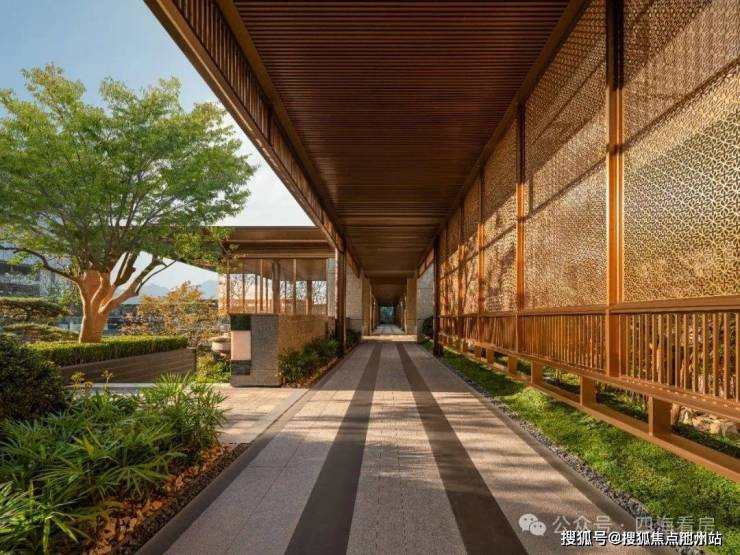 🔹项目打造东、南、西三个社区入口界面,东侧利用沿街景墙连同80m+的山水归家超级界面,入口大面积金属吊顶采取“万字曲水纹”图案,体验城市收藏级归家入口。西侧约60米社区大门为业主归家车行主入口,一线对望湖滨,以伴水归家水境营造奢华游园之旅。南侧大门为别墅洋房区人行入口,取意苏州园林借景手法,营造中轴主景观节点,出入可直接眺望南湖。
