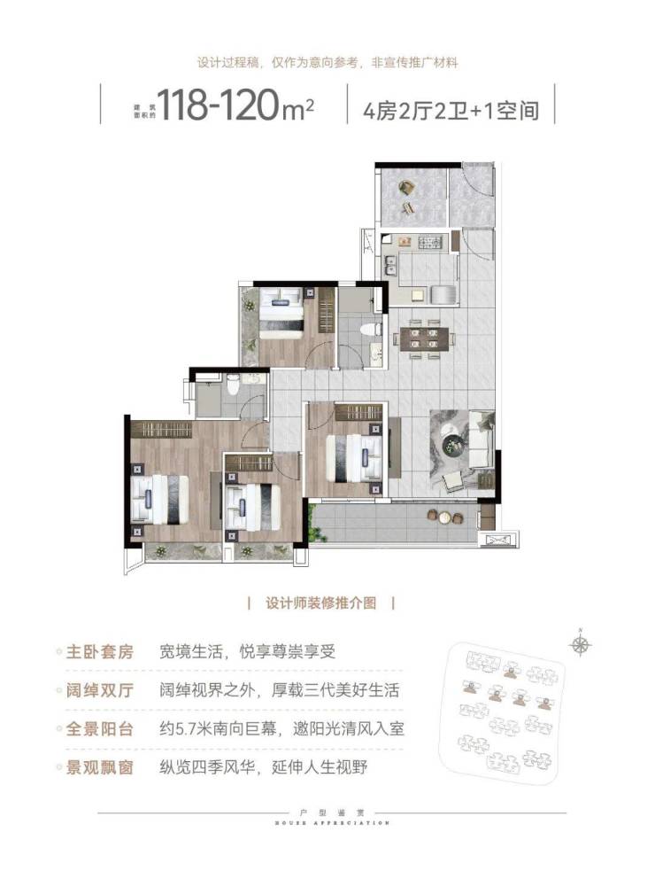 建面120平4+1房,入户处多了一个灵动空间,可改成5房,四开间朝南,全屋大飘窗设计,5.7米观景大阳台