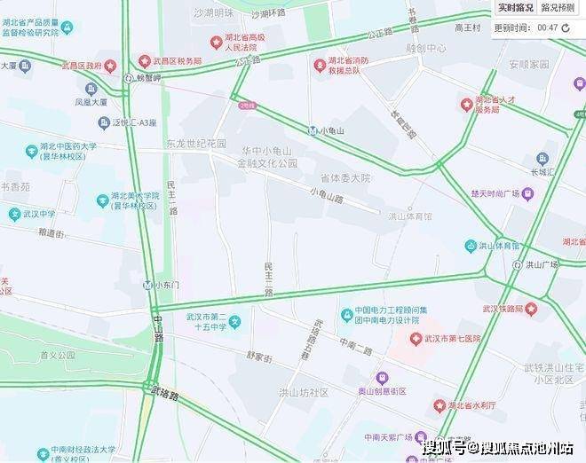 自驾:周边中山路、武珞路、中北路以及公正路、民主路等为区域主次干道,小龟山路只有双向4车道,自驾出行路网丰富,不过没有快速路,到二环线、武汉大道等快速路都比较远且堵,跨区域出行不是优势,主要依赖的中山路是著名的堵点,整个友谊大道中山路这一段车流量非常大。