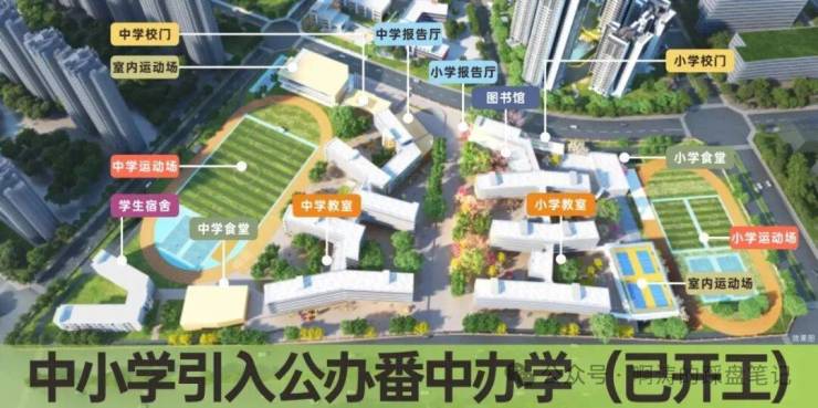 教育配套:配建12年全龄教育:9班幼儿园已封顶、42班小学36班初中已动工。中小学引入公办番禺中学办学(已签约)