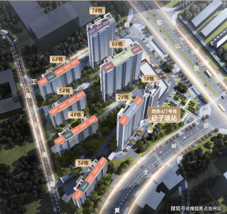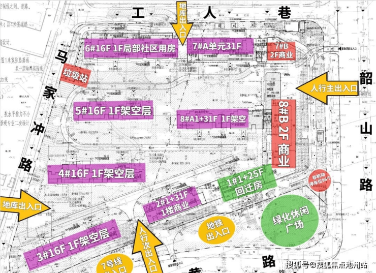 规划布局:采用 “高层 + 小高层” 混布局。西侧 3-6# 栋为2T2/2T3户16层小高层,东侧沿韶山路 2#、7#、8# 栋为 31 层高层(2T2 户)和底商;1# 栋的回迁房布置在东南角为T4的独立分区、单独入户(可以避免商品房住户与回迁住户入户交叉)。整体东高西低布局,能够一定程度上将韶山路的主干道的噪音进行阻隔。