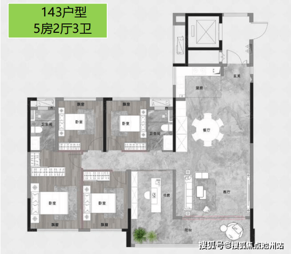 建面约143㎡户型2:5室2厅3卫