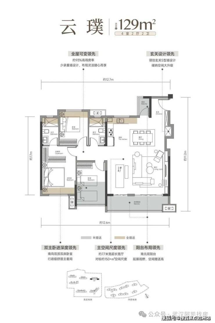 云璞户型建面约129平四室两厅两卫:此户型位于边户,南北通透,也是非常常见的边户,不过就129平这个面积段能做成四房,也是把功能性发挥到了极致!