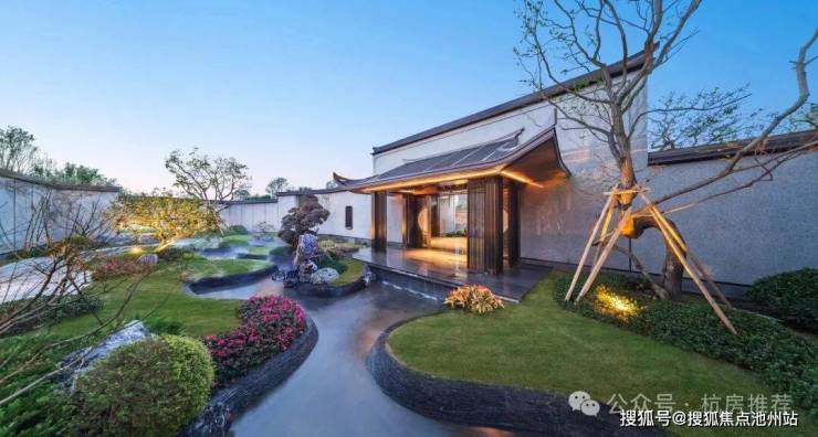 歇山顶式的文澜庭宛若漂浮在水面,堆叠造景的景石精选内敛沉稳的黑山石,质感十足。