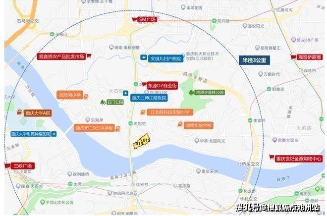 在这个地块的周边3公里范围内,分布着大量的商业、医疗、教育、交通资源。要江景有一线江景,要公园有网红公园鸿恩寺,距离观音桥商圈也非常近。