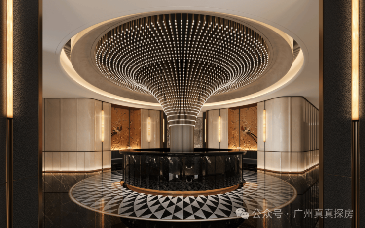 八重酒店式归家礼序,选用博物馆级环球石材,打造酒店式社区落客区;社区迎宾大堂(层高约9米);四季风雨连廊;单元豪华大堂;超配车库入口;车库地下豪华大堂;精装车马厅;臻享高定生活入户礼遇,塔尖圈层生活境界。
